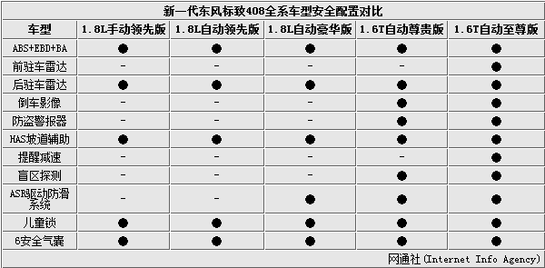 再来看各款车的配置表现。首先来看大家最为关注的安全配置。新一代标致408全系标配了6个安全气囊,分别为两个前气囊、两个侧气囊和两个侧气帘;ABS+EBD+BA和HAS坡道辅助、倒车雷达等配置也是全系标配。而1.6T车型配置更为丰富有倒车影像、防盗警报器等更为先进的安全配置。但单从1.8L排量几款车来看1.8L自动豪华版金币其他两款车多了一项ASR驱动防滑系统。
