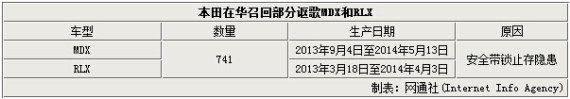 根据质检总局官方网站公布的消息,此次召回计划将涉2014款讴歌MDX和RLX两款车型。其中MDX生产日期范围是2013年9月4日至2014 年5 月13 日,RLX则是2013年3月18日至2014年4月3日期间生产。上述车型召回共计741辆车。