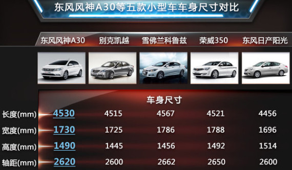 打造东风风神A30的全新DF1平台,脱胎于标致•雪铁龙集团引以为傲的PSA 1号平台,在针对车辆尺寸、技术标准、动力系统、适应性改进、电子系统以及安全性进行六大方面的升级,是两大汽车集团技术共享的最新产物。以DF1车型平台为基础,以东风集团严格的质量管理体系、世界500强优秀供应商体系为保障,A30为打造出众的乘坐空间,在车身尺寸和空间进行了针对性的研究,采用占用空间最小化,乘坐空间最大化的原则。新车的长宽高分别为4530mm*1730mm*1490mm,轴距则达到了2620mm,在和一些同级别主流车型的对比中,东风风神A30依然处于领先水平。