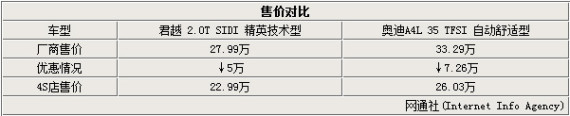 文所选的车型在售价上均维持在30万元内,其中君越2.0T精英技术型终端售价为22.99万,奥迪A4L 35 TFSI自动舒适型终端售价为26.03万;两者终端差价3万元,君越在价格上有很大的优势,同时别克在为购车的消费者提供多样化灵活购车方案,其中金融方案包括定额贷款、5050首尾贷款、等额本息贷款等,让准车主更加便捷。