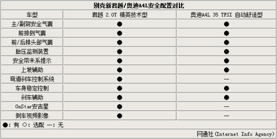 在主动安全配置方面,2.0T精英技术型配备最新版本ESC电子稳定控制系统,CBC弯道刹车控制系统、BAS刹车辅助系统、HillAssist坡道辅助系统、TPMS智能胎压监测系统、EPB电子驻车等安全系统。与奥迪A4L相比,多出弯道刹车控制系统以及安吉星、倒车视频影像等,同时其采用了高强度车身,可以满足各区域的法规需求。