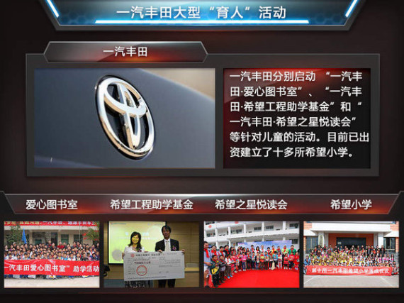 在儿童交通安全公益项目之外,针对儿童群体一汽丰田还曾分别启动 “一汽丰田·爱心图书室”、“一汽丰田·希望工程助学基金”和“一汽丰田·希望之星悦读会”等针对儿童的活动。其中一汽丰田于2006年就与中国宋庆龄基金会合作启动“爱心图书室”计划。该项目计划逐步为全国20个省的贫困地区小学建设600所爱心图书室。据马春平女士表示:截止目前,一汽丰田已超额完成任务,在全国各地先后建成了702所所爱心图书室,为十多万边远地区的儿童提供图书百万余册。虽然“爱心图书室”项目计划目标已经完成,但是一汽丰田表示会持续关注贫困地区儿童的教育问题,对“爱心图书室”所在的学校进行持续的援助。此外,网通社还了解到,一汽丰田目前已出资建立了十多所希望小学,让贫困山区的儿童能有更好的学习环境。