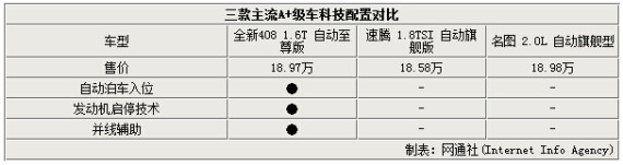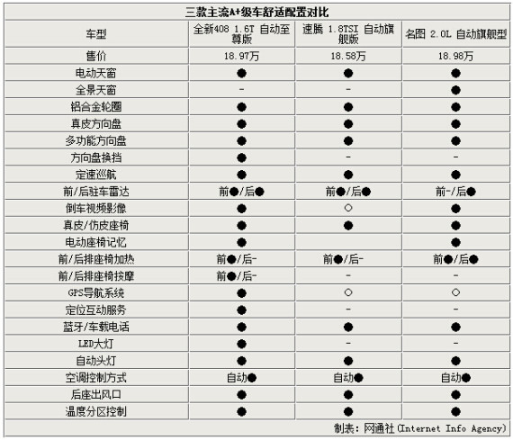 目前国内汽车市场细分化趋势明显,原先竞争相对较少的中级车(A+级)市场,随着各大厂商产品的推出,以及已有车辆更新换代,车型之间差距并不明显。在刚刚结束的成都车展上,东风标致全新一代408正式上市,新车相比老款车型实现了“由里到外”的改变,全新平台、动力总成以及配置,均提升该车在中级车市场的竞争力。网通社近日选取与其同级别的另外两款车型,一汽大众速腾 (配置|询价)与北京现代名图进行对比,看看在这三款国内主流A+级车究竟哪款性价比更高。
