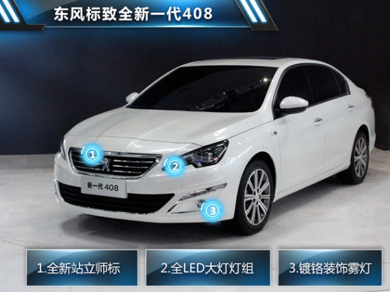 新一代东风标致408的前脸采用标致全新的设计风格,狮标从前引擎盖移到前格栅处,这种设计源于标致的Onyx概念车。此外,车辆配备全LED大灯,这在同级别车型中较为少见。对比大众速腾与现代名图,全新标致408在外观上极具辨识度。