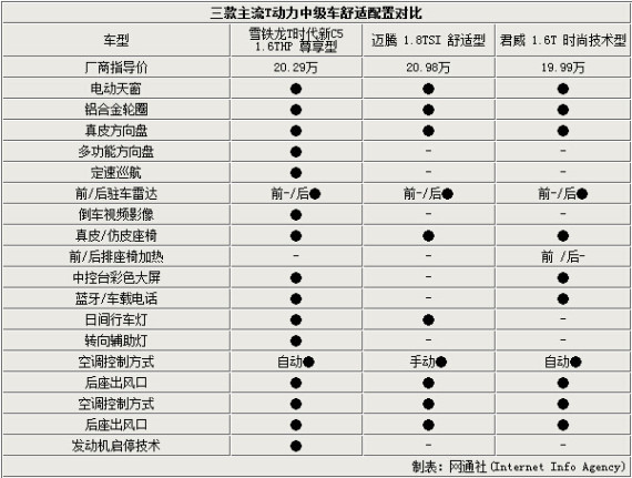 配置方面,所选取的三款主流中级车均配备了当前主流的配置,如电动车窗、后排出风口、自动恒温空调等等。而在舒适性配置上,以三款20万元档位车型来看,T时代新C5在其中绝对称得上第一。定速巡航、倒车影像、智能启停系统均是另外两款车型并未搭载的配置。