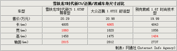 在选取的三款车型中,其价位区间均在20万元左右,而这个区间相信是中级车必争的重要细分市场。在这其中,东风雪铁龙T时代新C5与君威均搭载了1.6THP发动机,而大众迈腾则使用了1.8T引擎,接下来就让我们注意细节对比。首先,对于选购中级轿车的消费者而言,大多数人会优先考虑车辆的空间表现。刚刚上市的T时代新C5 ,其1.6THP车型与未使用增压引擎的车型,在车身尺寸上保持一致;但是在三款车型之中空间仍占据优势。据了解,T时代新C5长宽高分别4805mm/1860mm/1458mm,轴距则达到了2815mm。相比大众迈腾与别克君威车型而言,T时代新C5在轴距表现上位列第一名,这也进一步保证了该车后排乘客的腿部空间,对于中级车而言具有重要的意义。