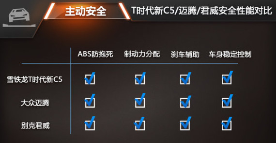 在安全配置方面,三款主流中级车均配备了牵引力控制系统、车身稳定系统等,其中牵引力控制系统能防止车辆的雪地等湿滑路面上行驶时驱动轮的空转,使车辆能平稳地起步、加速,尤其在雪地或泥泞的路面,牵引力控制系统均能保证流畅的加速性能,防止车辆因驱动轮打滑而发生横移或甩尾,从而进一步提升车身操控性能;而车身稳定系统则是在各种状况下均保持车身稳定。此外,三车还均配备了ABS防抱死系统以及刹车辅助系统。