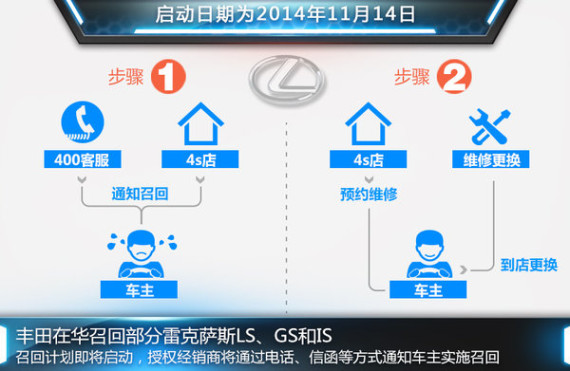 对于此次召回事件的相关信息,网通社以消费者的身份致电雷克萨斯中国客户服务中心官方400服务热线并进行咨询。对方表示:已收到厂商召回通知,召回计划将于2014年11月14日启动,雷克萨斯授权经销商将以电话、短信等方式通知车主实施召回。车主也可拨打官方客户服务热线,并提供车辆的车架号,以确认车辆是否涉及此次召回。