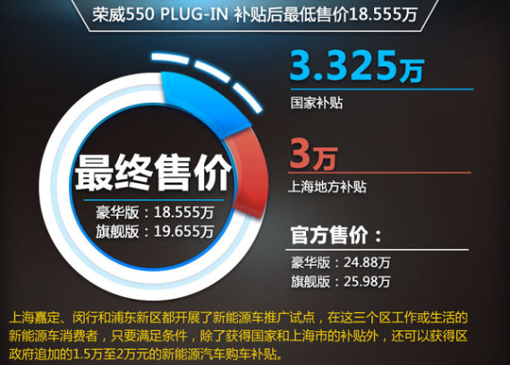 首先从价格方面,我们先来看荣威550 PLUG-IN旗舰版的车型售价为25.98万元。不过得益于年内最新国家颁布的新能源车型补贴政策,插电式混合动力轿车也纳入国家的补贴类型之一,国家补贴金额可达3.325万元,在不同地域和省市还会有额外的地方补贴。以上海为例,国家补贴3.325万元、上海地方补贴3万元、厂家对上海地区购买荣威550PLUG-IN,提供一站式免费充电安装服务以及1万元充电桩购买补贴和一年电费补贴(折合1500元)三项共计可以补贴近7.5万元;
