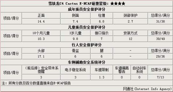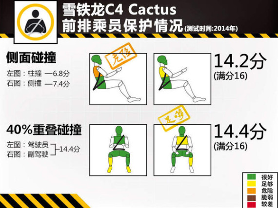 这次参加碰撞测试的车型是欧版2014款雪铁龙C4 Cactus,在E-NCAP发布的碰撞测试报告中,此车最终评定碰撞星级为4星,并没能摘得最高5星评级。C4 Cactus的柱撞测试成绩较低,并且车辆辅助安全项考核得分也不理想。但值得一提的是,新车在行人保护项测试中成绩较高。