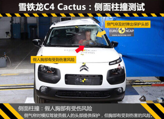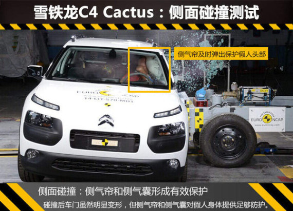 C4 Cactus新在相对温和的侧面碰撞测试中,侧气帘和侧气囊均及时弹开,虽然车门经撞击后已明显变形,但车内模拟驾驶员假人的头部得到良好的防护,同时胸部受到的保护也是足够的。此项测试满分8分,C4 Cactus的成绩为7.4。