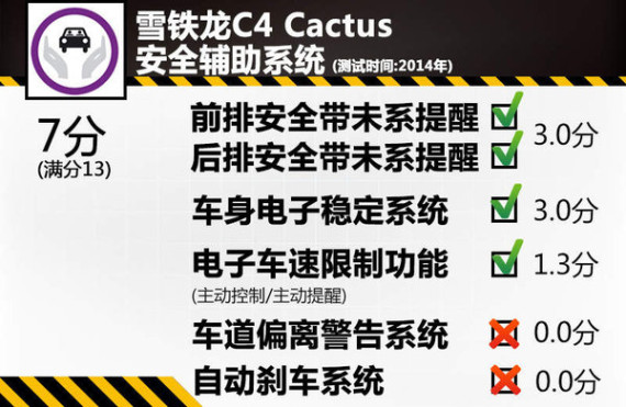 在车辆辅助安全系统测试中,雪铁龙C4 Cactus的成绩仅为7分。其中车道偏离警告系统和自动紧急刹车系统没有装备,因此这2大项主动安全考核没有得分。车身稳定系统、前后排安全带未系提示系统和电子限速功能都是此车的标准配置,并通过了欧洲新车安全评鉴协会(E-NCAP)考核。(网通社 2014年10月22日 北京报道)