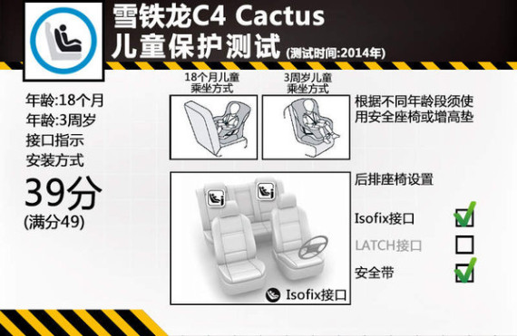儿童安全保护测试中,雪铁龙C4 Cactus在正面碰撞时3周岁模拟假人被合理约束在儿童座椅内,但颈部和胸部受冲击力较大;18个月模拟儿童假人则是头部受力较大。在侧面碰撞中,车内模拟儿童假人都能受到较为充分保护。在儿童座椅安全接口提示方面,此车在后排座椅提供了两个ISOFIX接口,所处位置操作均较为方便,安装指示的各种标识也非常清晰。C4 Cactus的副驾驶座位置安全气囊可以关闭,以便允许在座位上使用背向式儿童安全座椅,并且为驾驶员提供了清晰的使用方式信息以及警示信息。
