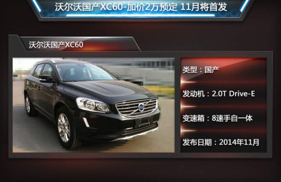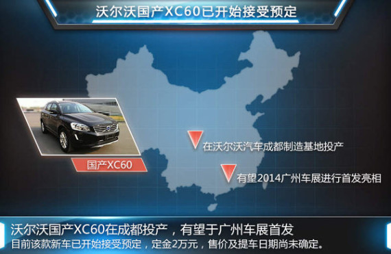 不久前沃尔沃XC Classic正式上市销售,此举是沃尔沃品牌首次将SUV车型实现国产化。在此基础上,XC60作为沃尔沃旗下的另一款SUV车型,也在华实现了投产。沃尔沃XC60 (配置|询价)国产版在外观上将与进口车型保持一致,动力上将搭载两款2.0T发动机。网通社通过走访多家沃尔沃4S店了解到,部分4S店已有样车到店。新车目前有两驱版和四驱版两款车型可供选择,可付2万元定金进行预定,4S店将在车辆上市后告知车辆价格和具体提车时间。此外,沃尔沃国产XC60有望在广州车展首发亮相,该车将成为沃尔沃亚太第三款投产新车。
