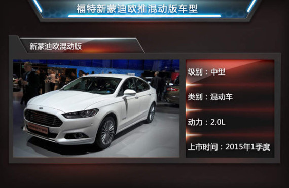 继蒙迪欧的姐妹款车型——美国版Fusion和C-MAX的插电混动版车型之后。福特新蒙迪欧混动车型将于明年一季度在欧洲市场上市。罗礼祥曾表示:“我们制订了‘同一个福特’计划,就是将福特在全球热销的先进技术车型都引入到中国市场,来满足中国市场的各方面需求。”在国内汽车市场,丰田凯美瑞混动版已推出多年,第九代雅阁未来也会引进混动版。作为全球第一大市场,新蒙迪欧混动车型也有望引入中国销售。