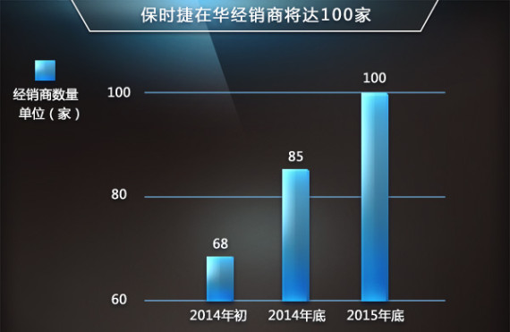 根据保时捷品牌在华发展规划,今年底经销商网络将由现在的68家增加至85家,并且这个数字会在明年继续提升,到2015年底有望突破100家。销量方 面,今年1-5月保时捷在华共售出16,465辆汽车,同比增长9.5%。对于今年的目标,保时捷中国总裁兼首席执行官潘德旭(Deesch Papke)在接受采访时表示:展望2014年全年,保时捷在华销量将继续以两位数比例增长。(网通社 2014年10月23日 法兰克福报道)