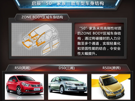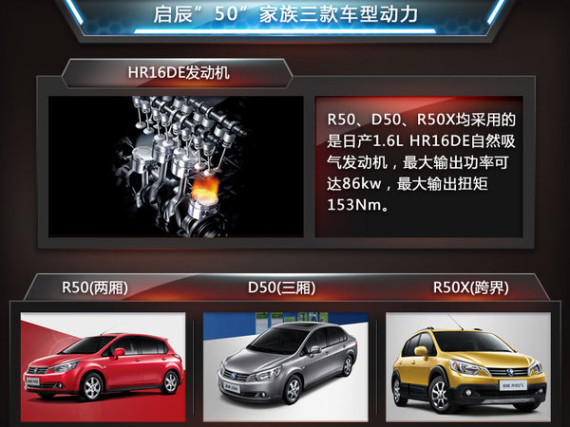 启辰“50”家族三款车型-R50、D50、R50X均基于日产骐达平台打造,三车的共同特点在于拥有自主车型的价格同时又具备合资车型的品质,在其余合资自主品牌车型中较为少见,这一点在其动力性、安全性以及配置等方面均有所体现。