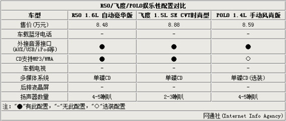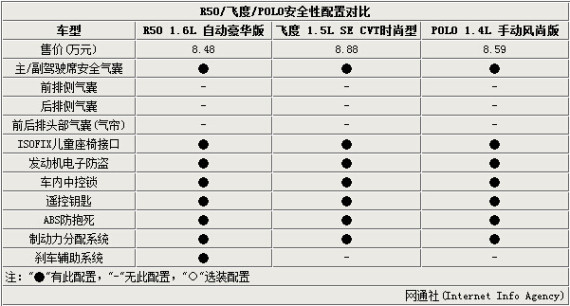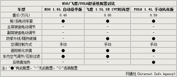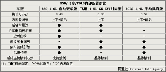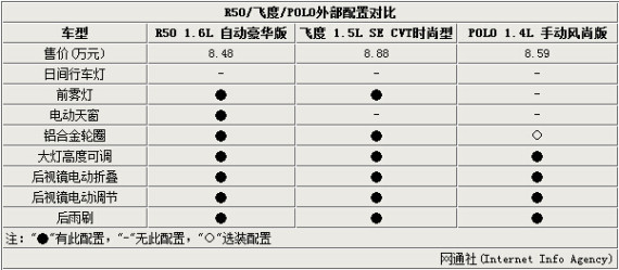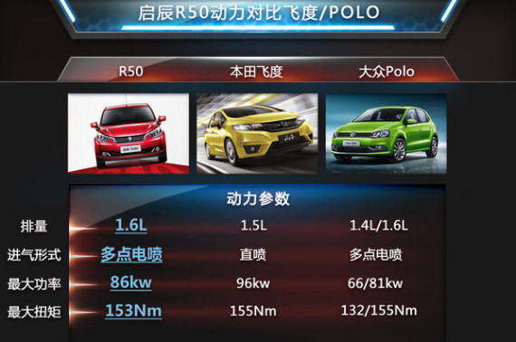 启辰R50和D50两款车型精彩版新增的8项配置,即使在面对时下热门的合资车型也具有一定优势。笔者将价格为8.5万元左右的R50 1.6L 自动豪华版、飞度 1.5L SE CVT时尚型和POLO 1.4L 手动风尚版进行了对比。