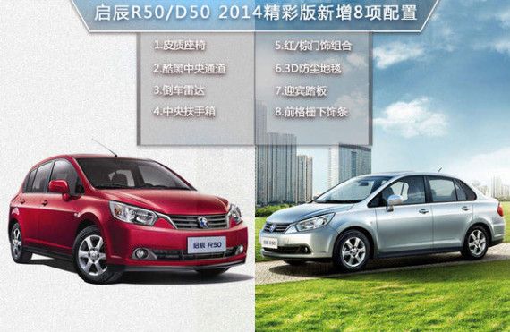 在延续“50"家族高能效、大空间、高品质优良传统的基础上,启辰根据用户反馈的真实用车习惯和消费需求,在D50、R50 2014精彩版上新增了皮质座椅、倒车雷达、中央扶手箱、红色和棕色的门饰组合、3D防尘地毯、迎宾踏板、前格栅下镀铬饰条以及酷黑中央通道(仅供R50)共8大配置,使其产品价值迈上一个新的台阶。