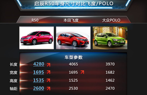启辰R50的车身尺寸分别为4280/1695/1535mm,轴距为2600mm。尽管新一代飞度较老款车型尺寸方面提升了不少,但除宽度与R50一致之外,飞度其他数据均比致炫小,这也直接影响了空间表现。而上海大众新款POLO的轴距仅为2470mm,从车身尺寸依据轴距所带来的空间来看,R50更具竞争力。