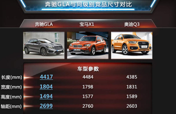 奔驰GLA作为一款定位在豪华紧凑型SUV市场的产品,奥迪Q3和宝马X1等与其同级别的车型将成为其主要竞争对手。在尺寸方面GLA的长/宽/高分别为4417mm/1804mm/1494mm,轴距则为2699mm,相比两位竞争对手而言,其处于中流位置。不过根据目前奔驰偏向运动的产品定位,这样的尺寸设计将为GLA带来更为灵活的驾控感受。(网通社 2014年10月27日 北京报道)