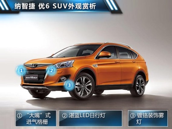 作为一款特别为80后年轻消费群体打造的全新车型,纳智捷 优6 SUV自然结合了时下众多流行的时尚元素,轿跑式的侧面线条也很好地展现出了其跨界的设计风格。为了展现运动气息,纳智捷 优6 SUV还融入大量类碳纤维元素,这种元素在前中网格栅、前后底部护板处均有所体现。此外,优6 SUV在前大灯内部加入了LED日间行车灯。按照L型排列的12颗LED灯,以纳智捷企业标准色蓝色为颜色,营造出了精雕细琢的钻石反射效果。