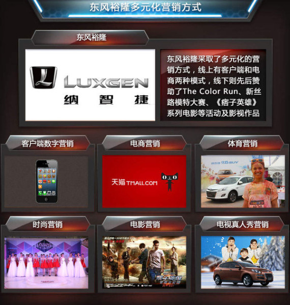 东风裕隆多元化的营销战略主要涵盖了两大方向,其中线上有客户端和电商两种模式,线下则有包括体育赛事营销、时尚活动营销和电视真人秀营销等。相比于传统的营销模式,如客户端数字营销这样的新兴模式不仅传播速度更快、覆盖面更广,同时也更加符合如今年轻消费者的生活习惯。在之前差异化营销的基础上又以人为出发点,融入了更多的趣味性和新鲜感。