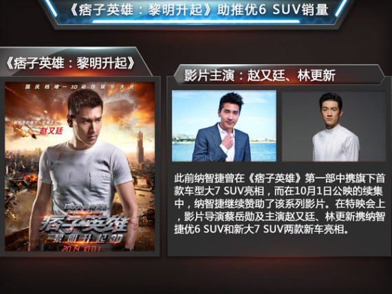提起纳智捷品牌和《痞子英雄》系列电影的渊源,还要追溯到在其首部影片中纳智捷大7 SUV的惊艳亮相,这也为之后该车在市场中一度处于供不应求的状态做了很好的铺垫。而在10月1日正式开始公映的续集中,纳智捷继续赞助了该系列影片。值得一提的是,由于该系列电影已树立了良好的市场口碑,再加上两位偶像实力派男演员坐镇,所以也让优6 SUV近期的销量持续飘红。