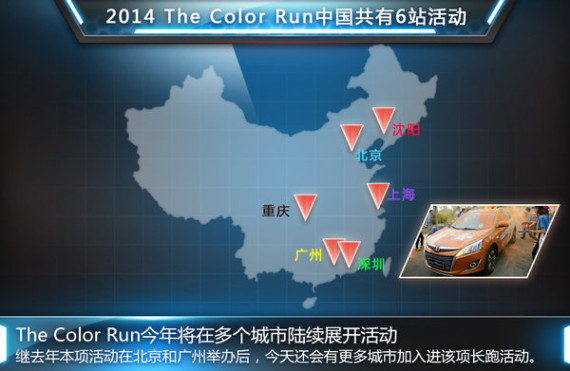 继去年在北京和广州成功举办之后,今年纳智捷赞助的The Color Run长跑赛事进一步扩大规模。继3月29日深圳站首站开跑后,在重庆、北京、沈阳、上海等4大城市陆续展开,11月1日,2014The Color Run收官战将在广州开跑,时间跨度长达7个月。在这段时间,纳智捷 优6 SUV均作为这项快乐赛事的领跑车,出现在The Color Run的活动现场与比赛中。对于纳智捷而言,通过赞助趣味体育赛事来提升自身品牌影响力无疑是一种很好的营销方式。