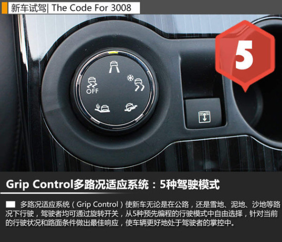 谈到东风标致3008的经典设计,不得不说的就是低风阻超大视野前风挡和Grip Control多路况适应系统。前者使3008获得更高的安全性和舒适性,并有降低油耗的效果;后者可以弥补3008作为两轮驱动的SUV车型在越野性能上的不足。