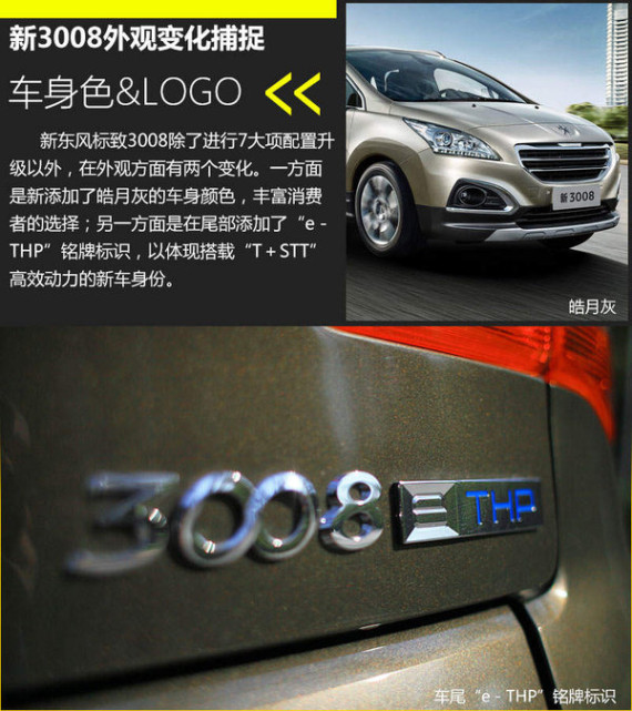 新东风标致3008除了进行7大项配置升级以外,在外观方面有两个变化。一方面是新添加了皓月灰的车身颜色,丰富消费者的选择;另一方面是在尾部添加了“e-THP”铭牌标识,以体现搭载“T+STT”高效动力的新车身份。此外,新车还新增了一款1.6THP经典版作为搭载T动力的基础配置车型,以满足追求高效动力但并不很看重配置的消费者。