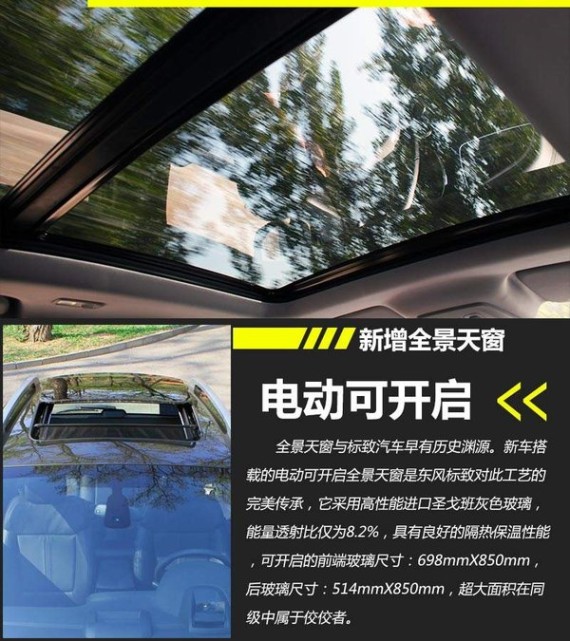 全景天窗与标致品牌有着很深的历史渊源,标致是汽车天窗的发明者。新3008所搭载的电动可开启式全景天窗是东风标致对这一技术的完美传承,其采用进口圣戈班灰色玻璃,具有良好的隔热保温性能,可开启的前半部分尺寸为698mmX850mm,不可开启的后半部分尺寸为514mmX850mm,总面积达到了1.06平方米。出色的全景天窗设计增加了车内视野及采光,并具备车窗防夹、一键式控制和可由遥控钥匙关闭的功能,同时配备了电动卷帘。