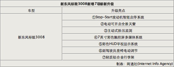 10月27日,网通社编辑对新东风标致3008进行了试驾。在现款车型的基础上新车进行了7项崭新配置的提升。其包括:Stop-Start发动机智能启停系统、电动可开启全景天窗、主动式胎压监测、7英寸彩色触控屏多媒体系统、彩色HUD平视显示系统、副驾驶员座椅电动调节、轻质铝合金行李架。新车在保持强劲动力性能的同时,大大降低了燃油消耗,智能的科技装备进一步提升了科技感,满足消费者对SUV车型越野气质和个性的需求。下面,网通社将逐一介绍上述配置升级,帮助网友对此车进行全面了解。