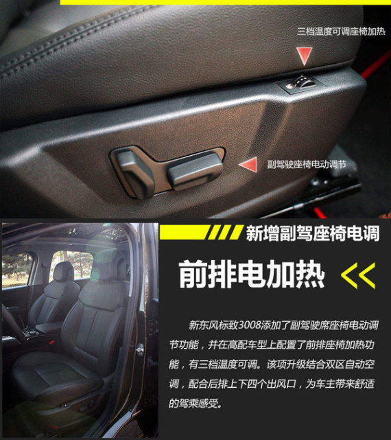 新车添加了副驾驶席座椅电动调节功能,并在高配车型上配置了前排座椅加热功能,有三档温度可调。该项升级结合双区自动空调,配合后排上下四个出风口,为车主带来舒适的驾乘感受。