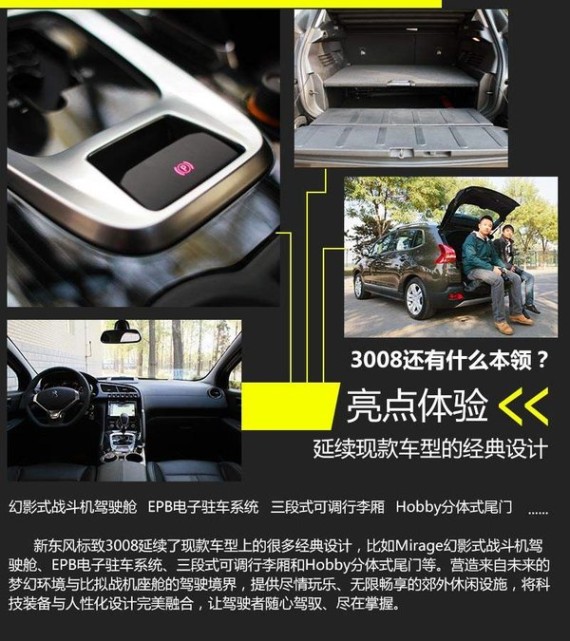 新东风标致3008延续了现款车型上的很多经典设计,比如Mirage幻影式战斗机驾驶舱、EPB电子驻车系统、三段式可调行李厢和Hobby分体式尾门等。营造来自未来的梦幻环境与比拟战机座舱的驾驶境界,提供尽情玩乐、无限畅享的郊外休闲设施,将科技装备与人性化设计完美融合,让驾驶者随心驾驭、尽在掌握。