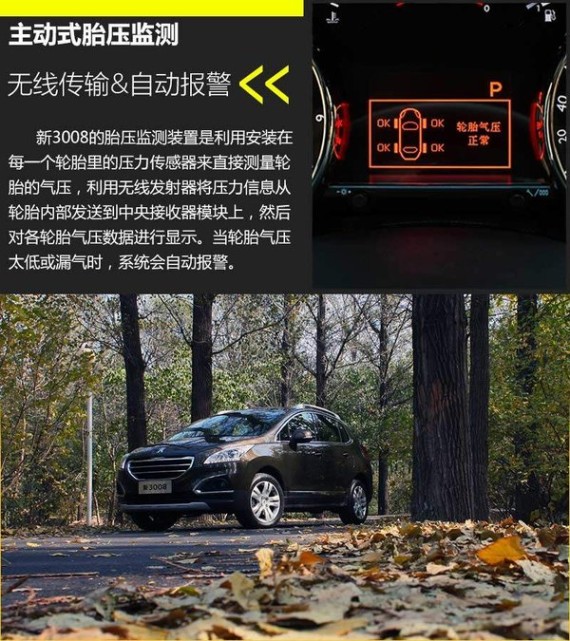 轮胎是唯一与地面接触的车辆关键组成部分,它的状况是否良好,直接关系着车辆的行驶是否安全。新东风标致3008所增加的胎压监测装置是利用安装在每一个轮胎里的压力传感器来直接测量轮胎的气压,利用无线发射器将压力信息从轮胎内部发送到中央接收器模块上,然后对各轮胎气压数据进行显示。当轮胎气压太低或漏气时,系统会自动报警。通过胎压监测系统,驾驶者可预知来自轮胎的不稳定因素,随时关注轮胎压力的变化,掌控行车安全。
