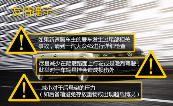 另外由于大众汽车公司需要对于金属衬板等召回涉及的相关部件及手续有一定的准备时间,其将于2015年2月2日正式启动召回,在这段时间网通社希望能让大家的行车更为安全,提出几条建议:首先如果有部分新速腾车主的爱车发生过尾部的相关事故,请到一汽大众4S进行详细检查,因为若后臂纵轴发生弯曲,当车辆在颠簸路面行驶时便有可能发生断裂。第二,尽量减少在颠簸路面上行驶或是激烈驾驶,对于行车安全也有一定影响。(网通社 2014年10月28日 北京报道)