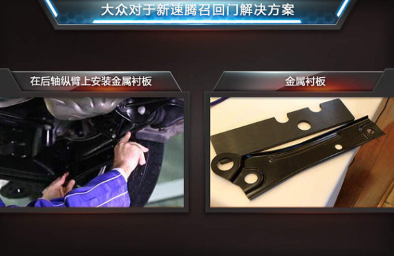 对于此隐患大众汽车公司已给出解决方案,将首先对召回后车辆进行检查,并在后轴纵臂上安装金属衬板。待金属衬板安装好后,如在出现后轴纵臂断裂现象时,金属板将可以保证车辆的行驶稳定性,并会发出持续的警示性噪音提示车主。对此一汽-大众销售有限责任公司总经理胡汉杰表示:到目前为止,我们已经检测了6.7万辆有关的新速腾,这个检测是用工具进行专业检测的。这里告诉大家,所有检测的车辆并没有发现断轴的情况。另外根据大众所公布的信息,未消除速腾车主对于产品的顾虑,将为召回范围内正常使用车辆的后悬架提供十年保障。