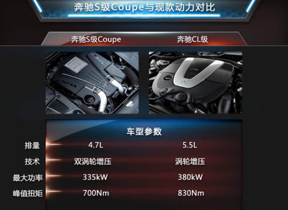 奔驰全新S级Coupe是基于全新S级所打造的一款旗舰级轿跑车。车身尺寸方面S级Coupe的长宽高分别为 5027mm/1899mm/1411mm,轴距2945mm。在动力上搭载了一台4.7T双涡轮增压发动机,最大功率335kW,最大扭矩700Nm,相比上一代奔驰CL级所采用最大功率380kW,最大扭矩830Nm的5.5L涡轮增压引擎而言,虽最大功率和扭矩两项数值均有所下降(分别下降45kW和130Nm),不过通过排量的大幅下降将使全新车型拥有更为出色的燃油经济性。(网通社 2014年10月29日 北京报道)