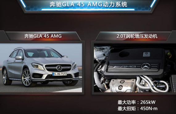 奔驰GLA 45 AMG是旗下紧凑型SUV产品GLA的高性能版本,其在动力上搭载了与目前已上市销售的A 45 AMG和CLA 45 AMG相同的2.0T涡轮增压发动机,最大功率265kW,峰值扭矩则达到了450N·m,堪称全球最强劲的量产四缸发动机。