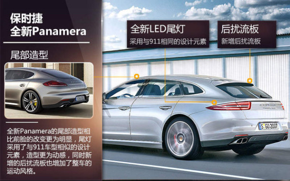 全新一代Panamera的外观造型相比现款而言更具视觉冲击力,经过重新设计的头灯更为犀利,并取消了现款四眼式设计,位于头灯周围的四个LED光源虽与现款采用相同的风格,不过整体效果得到了强化。相比前脸造型而言,全新车型在尾部上的变化更为明显,与现款911系列车型相似的尾灯设计,让其更具有保时捷家族的造型基因。同时新增的尾部扰流板以及更为丰富的线条设计,使得新车型的运动风格得到了加强。