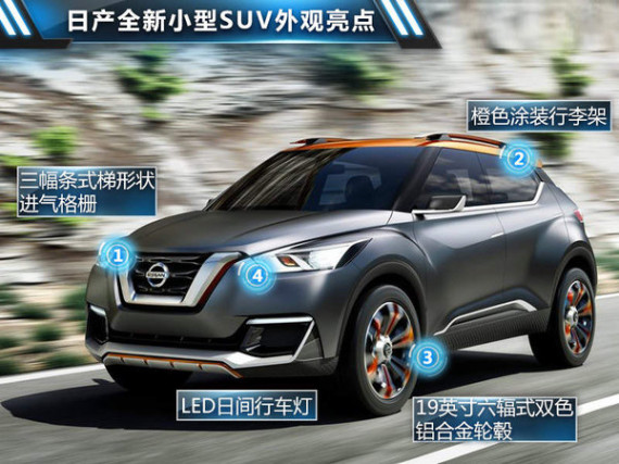 在北京现代ix25及广汽本田缤智上市之后,SUV已经成为十月的代名词。作为日韩车企中备受大家关注的日产公司也在日前发布了名为Kicks的概念车官图。Kicks是继日产Juke、逍客、奇骏的第四款SUV车型,这将意味着日产将全面向SUV市场发力。网通社从worldcarfans获悉,此款名为Kicks的SUV将于10月底举办的圣保罗车展正式亮相,将与本田CR-V竞争SUV市场。
