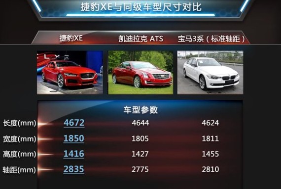 在车身尺寸方面,其长宽高分别为4672/1850/1416mm,轴距为2835mm。与同级竞争对手标准轴距版的宝马3系、凯迪拉克ATS等相比,捷豹XE同样有着较大的优势。与修长的车身相比,短小的车尾看起来很紧凑、动感。尾灯依然采用了横置布局,内部设计则融入了一些F-Type跑车的元素,双边单出的排气布局十分符合国内消费者的喜好。