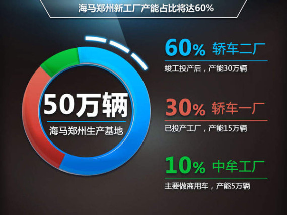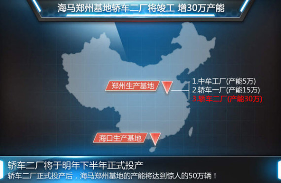 从2010年海马郑州全新工厂项目奠基至今,历时四年,耗资30亿元的海马郑州轿车新工厂将于明年下半年正式投产,主要产品为小排量经济型轿车,设计产能为30万辆。此工厂投入使用后,将使海马郑州基地的年产能达到惊人的50万辆。据相关人士透露:海马汽车第三工厂正式竣工投产后,将会生产海马旗下高端车型,还有投产部分海口基地的产品。未来将会涉及的车型包括B-级轿车、SUV、MPV等车型。