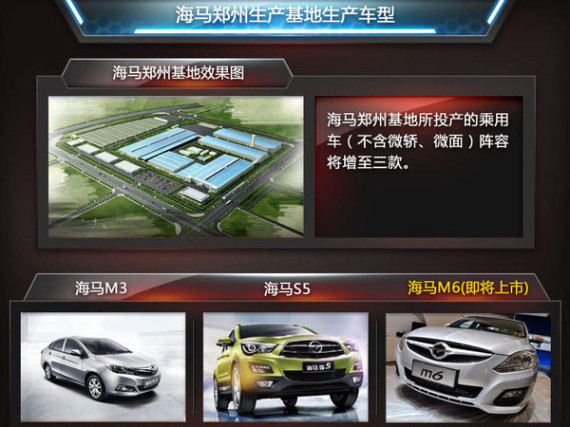 海马集团郑州生产基地30万辆轿车的项目完善了海马集团以中原为中心向全国市场扩张的战略意图,与此同时,海马的“中原布局”正式成形,实现了郑州与海口“两极”的遥相呼应。海口基地偏重于生产家用、舒适性产品,延续海马汽车的经典主力车型。而海马汽车个性化、年轻化的产品将投放于郑州基地生产,郑州基地的车型将面向更加年轻的消费群体。现阶段M3和S5在郑州基地生产,明年一款定位为B-级家轿的M6车型也将于郑州轿车一厂投产,并推向市场。届时,海马郑州基地所投产的乘用车(不含微轿、微面)阵容将增至三款。
