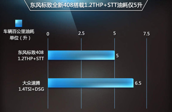 东风标致新一代408在搭载1.2THP直喷发动机后,不仅动力表现出色,在油耗方面将会更为出众。更小的排量搭配先进的微混系统使新车的百公里油耗仅为5升,比主流的A+级车一汽-大众速腾1.4TSI版本每百公里省油1.5升。不难看出,东风标致新一代408在动力性能和燃油消耗这两大指标上有着明显的优势。据悉,东风标致将于明年第一季度推出新一代408搭载1.2THP直喷发动机的车型。“1.2THP+STT”的动力组合在新车推出后,将使东风标致在竞争日趋激烈的A+级轿车市场具有更大的竞争力。(网通社 2014年11月5日 北京报道)相关文章阅读:·全新408/速腾/名图 国内主流A+级车对比2014-10-21·全系都有智能启停 新一代408车型导购2014-10-14·PSA在华产能-反哺全球 新408等出口欧洲2014-10-11