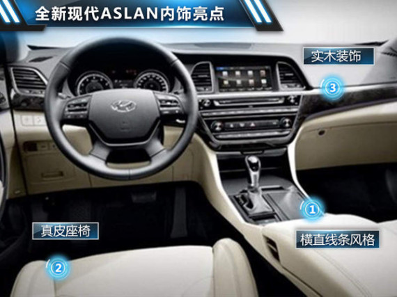 在内饰上,现代Aslan和此前发布的新一代索纳塔风格类似,同样又借鉴了大量捷恩斯车型的设计,均采用横直的线条来勾勒。真皮座椅的和实木装饰的加入都在为其豪华度加分。同时据悉此外,全新现代Aslan车型使用了双层玻璃,更好的提升整车的隔音降噪水平。