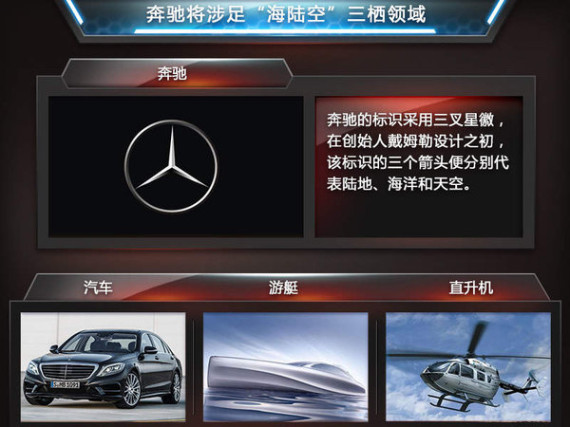 众所周知,奔驰的品牌标识采用三叉星徽图案,而在创始人戴姆勒的设计之初,该标识的三个箭头便分别代表陆地、海洋和天空。由此可以看出奔驰对于“海陆空”的三栖向往,早在创立之初便已有所规划。而随着奔驰在全球汽车市场中所获得的巨大成就,也为向海洋和天空打下了坚实基础。