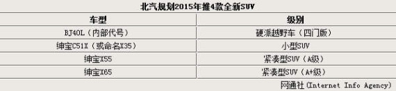 北京汽车于去年年底推出旗下专业越野SUV车型BJ40,令企业实现了从中高端轿车、经济型轿车到越野车、微车全产品线的布局。为了进一步提振销量,北汽开始了新一轮产品投放计划。据记者了解:北汽明年将先后发布4款SUV产品,其中X65在明年3、4月份左右亮相,上市后将对标长安CS75和广汽传祺GS5等主流紧凑型SUV,该车也将成为绅宝品牌的首款SUV车型。BJ40四门版于明年年底推出,另外还有X55和一个A0级的小SUV。在产品线进一步得到丰富后,北汽完全有实力和专业生产SUV的长城哈弗一较高下。