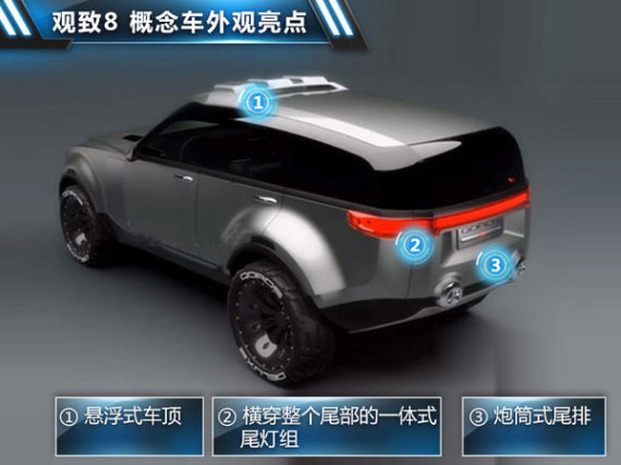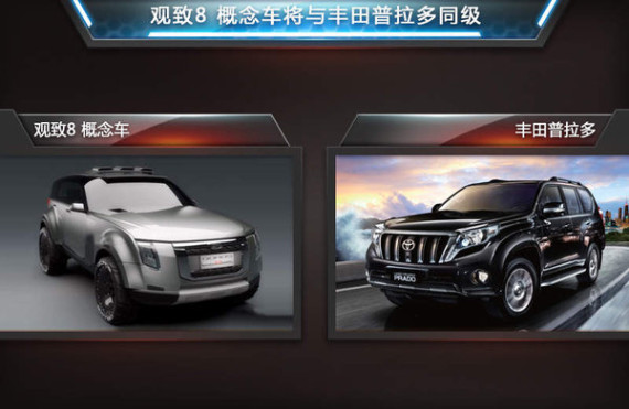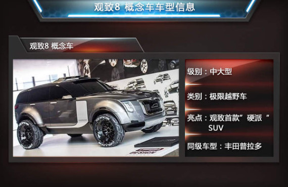 根据观致此前对于车型的命名方式,不难看出这款名为观致8的概念车是一款新的旗舰SUV车型。从车身造型来看,该车线条硬朗、车体厚重,符合高端豪华车的 定位。虽然身为一款概念车型,可能拿来与一款量产车比较不算十分妥当,但考虑到其潜在的市场定位,观致8概念车应该是与丰田普拉多这样的专业SUV属同一细分领域。